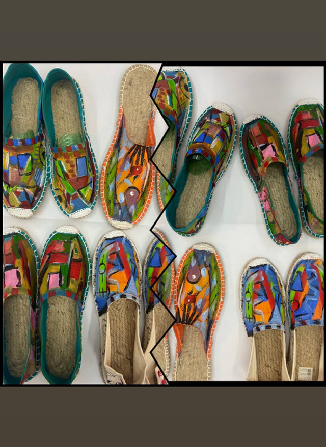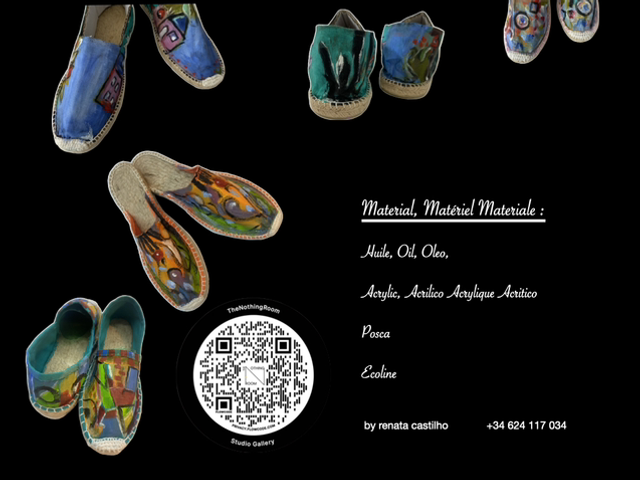 One of kind with 100% vegetable jute sole and 100% cotton fabric on the top, painting or in oil, or Posca.